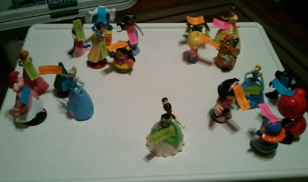 Our first musical was on April 29, 2012. We had about 20 children participate. Being very inexperienced in musical theater, I used whatever ideas came to mind to help me visualize the flow of the story. Since my own kids were very young at the time, it made sense to me to use my daughter's princess figurines to work out our scene changes. Each character had a little post-it note attached to it with the name of a choir member on it. It worked at the time!