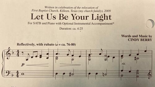 As a composer, I am occasionally asked to write commissioned anthems. Sometimes an anthem is written to commemorate a church's anniversary or to honor a church staff member. But in early 2009, I was asked to consider writing a commissioned anthem for the relocation of First Baptist, Killeen - my own home church. What an honor that was! I prayed about it and felt that the Lord was indeed leading me to write the anthem.After spending a lot of time in thought and prayer, I kept being drawn to the theme of Light. There are many passages in the Bible that refer to light. JESUS Himself is referred to as "the Light of the world," "the Light of life," and "the Light in the darkness." And in Matthew 6, we read Jesus' words to believers: "You are the light of the world ... Let your light shine before men, that they may see your good deeds and praise your Father in heaven." I kept these passages in mind as I wrote the lyrics, and gave it the title "Let Us be Your Light."